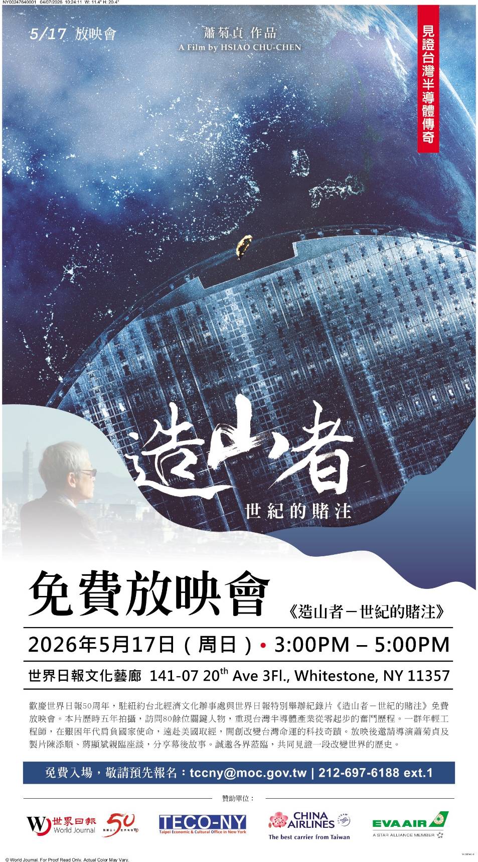 今年適逢世界日報創刊50周年,駐紐約台北經濟文化辦事處與世界日報合作,在5月17日星期日下午3時至5時於世界日報文化藝廊舉辦 《造⼭者-世紀的賭注 A Chip Odyssey》 放映會,並邀請導演蕭菊貞與製⽚陳添順、蔣顯斌參加映後座談,活動免費,歡迎讀者與各界人士前往觀賞。