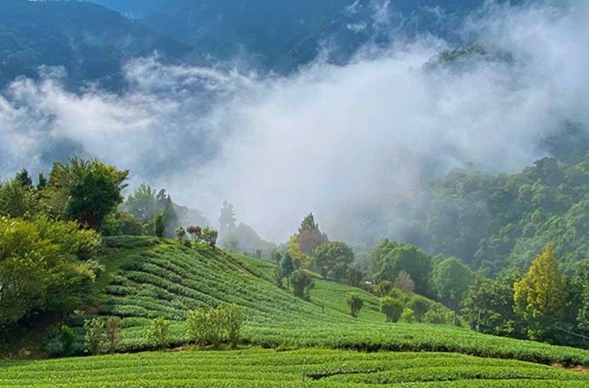 杉林溪高山茶園雲霧蒸騰。杉林溪茶區海拔800公尺到1950公尺,