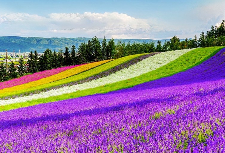 日本北海道富良野薰衣草。世界四大薰衣草產地為法國普羅旺斯、日本北海道、俄羅斯高加索山與中國伊犁。富良野的薰衣草是以深淺紫色𤔡主調,偶而也有異色交織,紛繁其間。