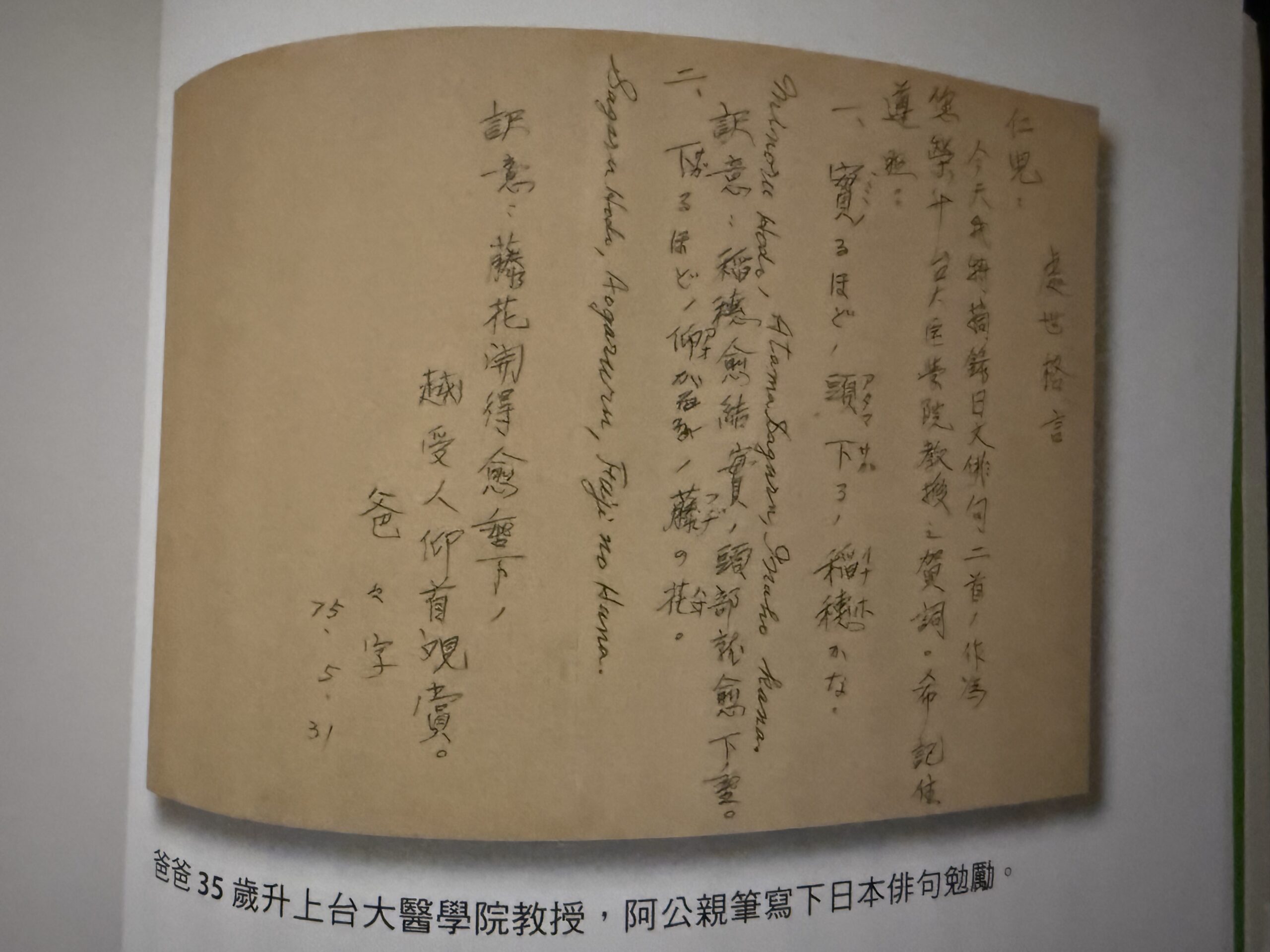 在陳建仁的職業生涯裡,有幾件事是他個人,也是台灣人都記得的。他是台大最年輕的教授(35歲),當年得知消息,高興驕傲之餘,打電話跟父親報喜,沒想到那個在他心目中一直像幕府將軍的父親,不覺有什麼了不起,親筆寫下日本俳句勉勵他,要他不可驕傲。講到這事,他也想到一件與阿公有關的事與女兒分享。